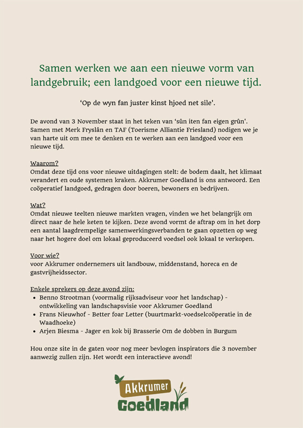 Waarom? Omdat deze tijd ons voor nieuwe uitdagingen stelt: de bodem daalt, het klimaatverandert en oude systemen kraken. Akkrumer Goedland is ons antwoord. Een coöperatief landgoed, gedragen door boeren, bewoners en bedrijven.